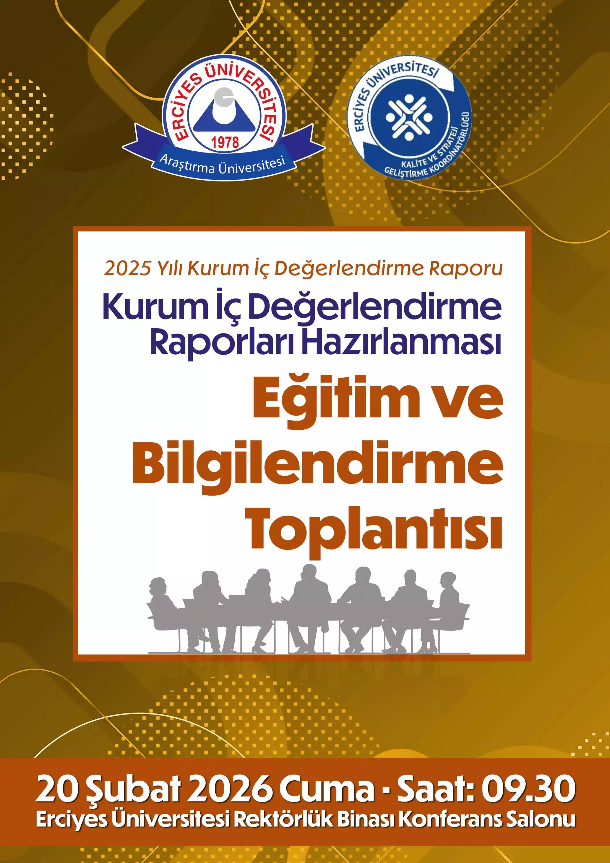2025 Yılı Kurum İç Değerlendirme Raporu KIDR Hazırlanması Eğitim ve Bilgilendirme Toplantısı 20 Şubat 2026 Cuma Rektörlük Binası Konferans Salonunda düzenlenecektir.
