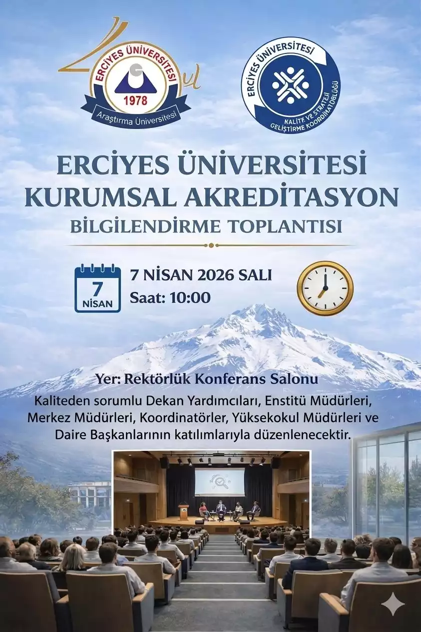 Kurumsal Akreditasyon süreci ile üniversitemizin kalite kültürünün yaygınlaştırılması, sürdürülebilir kalite yönetimi anlayışının güçlendirilmesi ve sürekli iyileştirme çalışmalarının desteklenmesi amaçlanmaktadır. Bu kapsamda 7 Nisan 2026 tarihinde gerçekleştirilecek toplantıya Kaliteden sorumlu Dekan Yardımcıları, Enstitü Müdürleri, Merkez Müdürleri, Koordinatörler, Yüksekokul Müdürleri ve Daire Başkanlarının katılımı önem arz etmektedir.